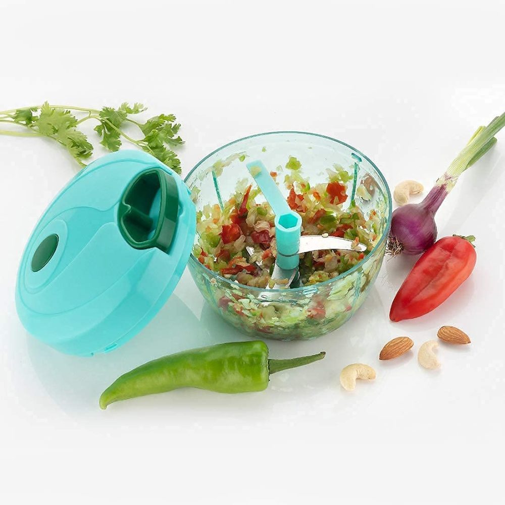 - The chopper has 3 sharp stainless steel blades that cut through vegetables easily. The number of pulls determine the size of the cuts