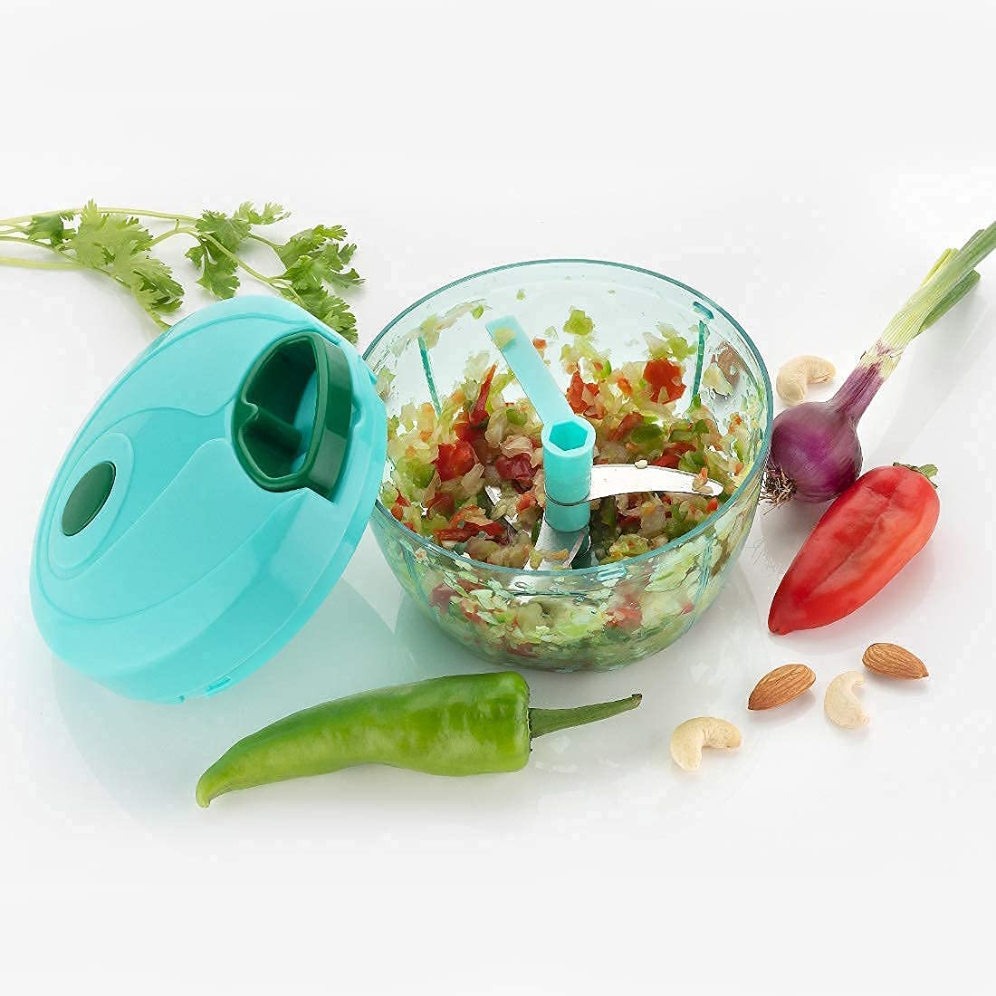 - Perfect for cutting onions, garlic, tomatoes, vegetables, salads, herbs, fruits, boneless meat, nuts and more in seconds with Ideal capacity of 450 ml that is compact to use and store